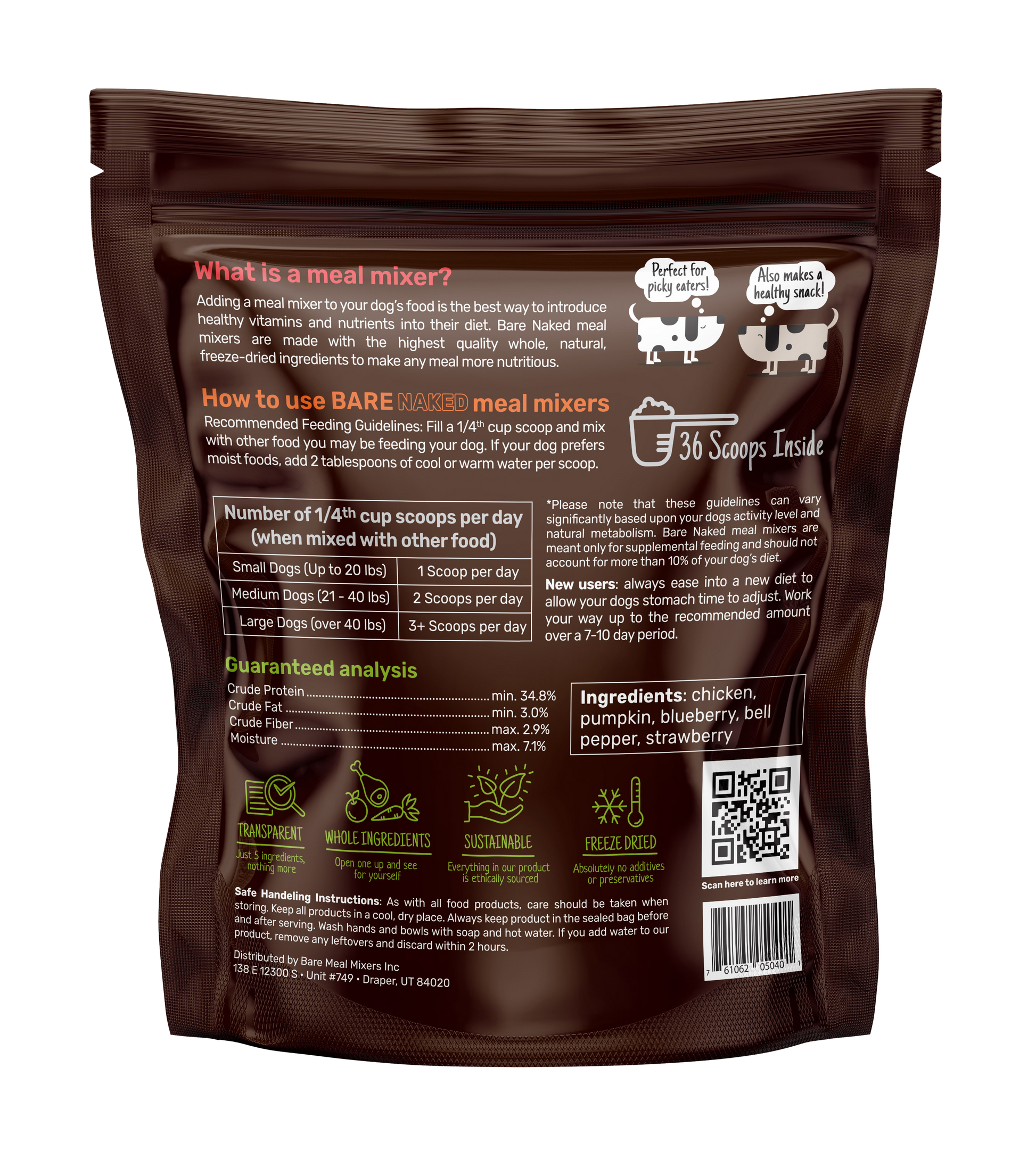 Just 5 ingredients, nothing else. Freeze-dried raw protein, vegetables, & fruits bringing a punch of flavor & nutrients to every occasion. The flagship meal mixer from Bare. It's made with cage-free chicken. Mix into your dog's daily meals, use for the tastiest lick mats, or use as a healthy snack! Bare is great for picky eaters!